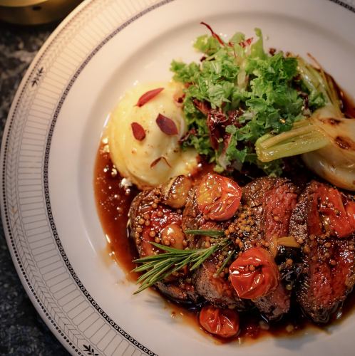 采用特殊工艺,使优质牛肉风味更佳。它与香气扑鼻的迷迭香土豆完美搭配,是您只能在这里享用的美味佳肴(梅田/意大利/餐厅酒吧/约会/夜景/周年纪念/生日/惊喜/东通/中崎町/大阪站/梅田站/生日套餐/梅田站晚餐)